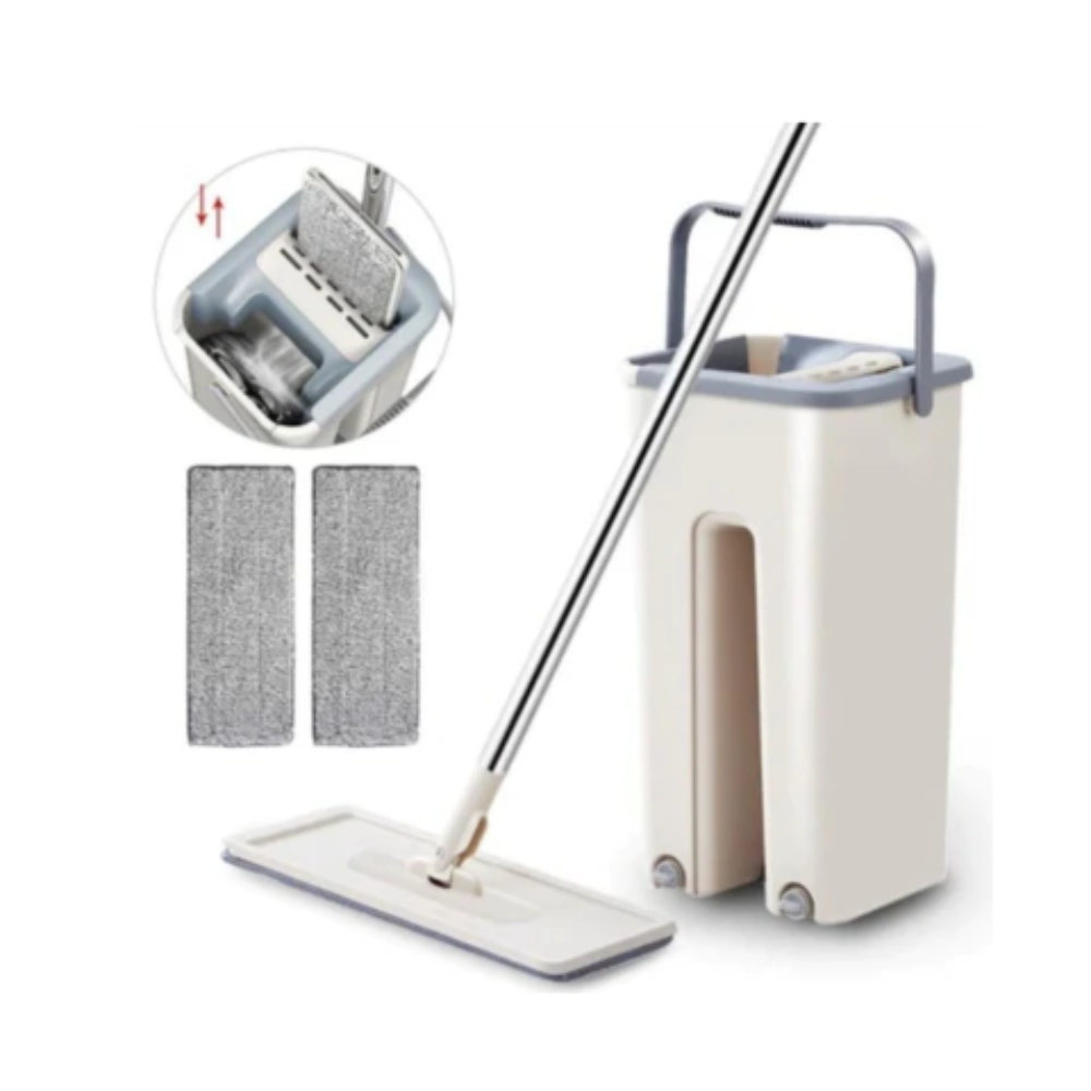 Set de limpieza con balde escurridor y mopa plana con giro 360°. Ideal para todo tipo de pisos. Práctico, higiénico y fácil de usar.